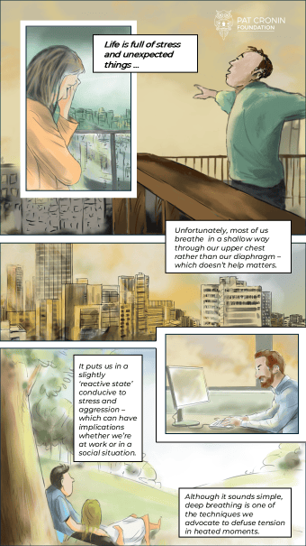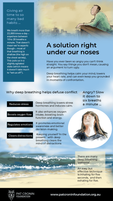 At the Pat Cronin Foundation, our presenters emphasise the power of deep breaths to help calm down in tense or aggressive situations – a notion backed up by experts in the field such as Monash University’s Shawn Ashkanasy.